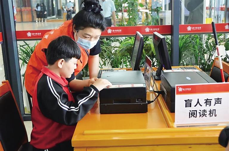 在全国助残日开展“体验无障碍 城市充满爱”主题活动。图为视障儿童体验有声阅读机。