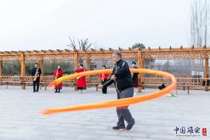 群众在迎曦湖公园吹萨克斯、舞甩龙。中国雄安官网毛鹤然 摄