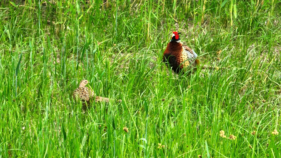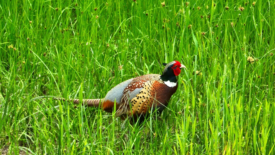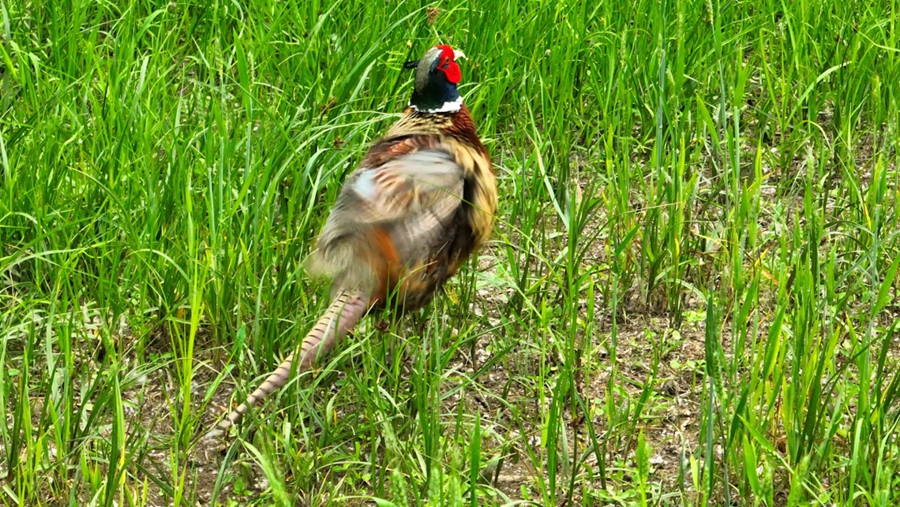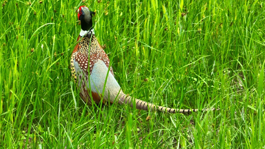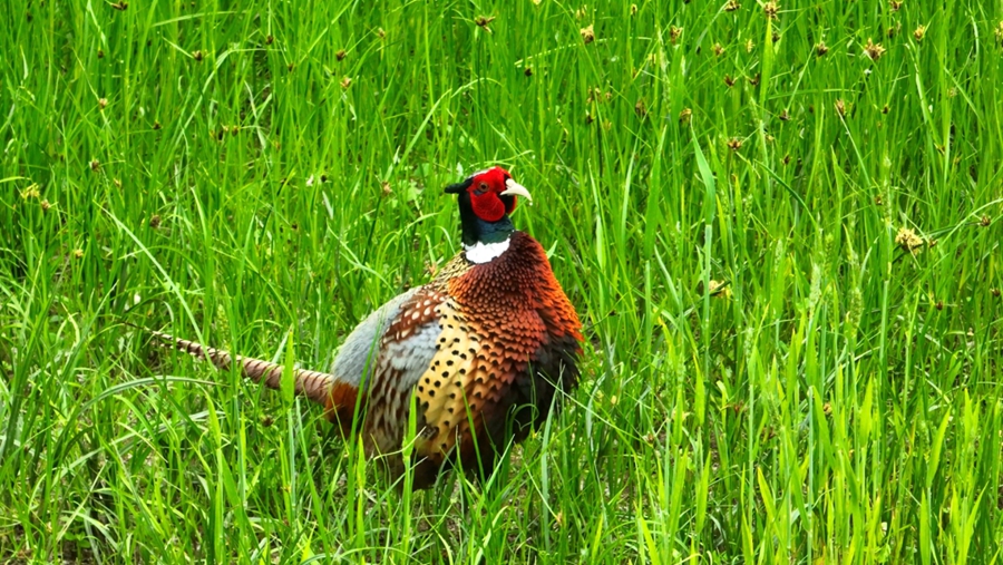初夏的雄安,白洋淀碧波荡漾,千年秀林郁郁葱葱,蓝绿交织,清新明亮。近日,在雄安新区雄县林业综合服务中心组织的鸟类监测活动中,爱鸟护鸟志愿者在白洋淀和千年秀林交界区域记录到国家“三有”保护动物环颈雉活动的影像,进入繁殖季的雄性环颈雉换上了美丽的羽毛,头上长出了角羽,它漫步在灌丛杂草间,时而扇动着翅膀,打鸣叫唤,来显示势力范围和领地,时而陪伴在雌鸟旁,抖动着艳丽的羽毛炫耀自己。
