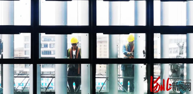 工人们对外遮阳梭型百叶系统进行安装调试。河北新闻网记者刘光昱 摄
