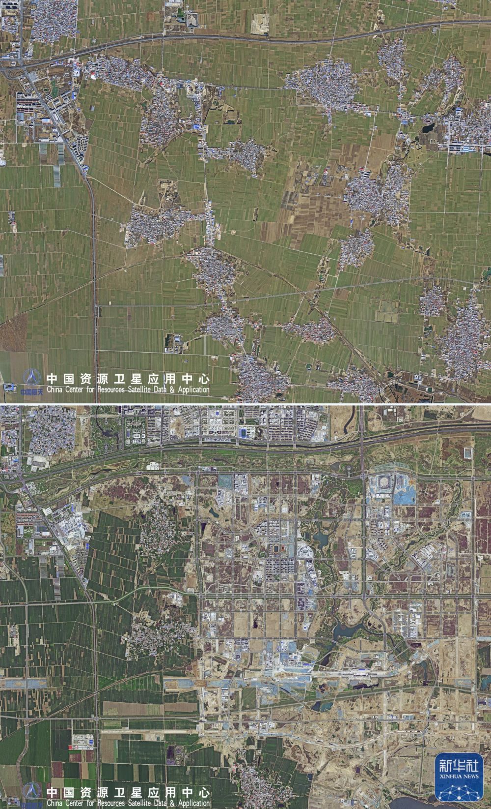 这是一张拼版照片:上图为2017年2月23日拍摄的雄安新区启动区部分地表;下图为2023年5月10日拍摄的雄安新区启动区部分地表。新华社发(中国资源卫星应用中心提供)