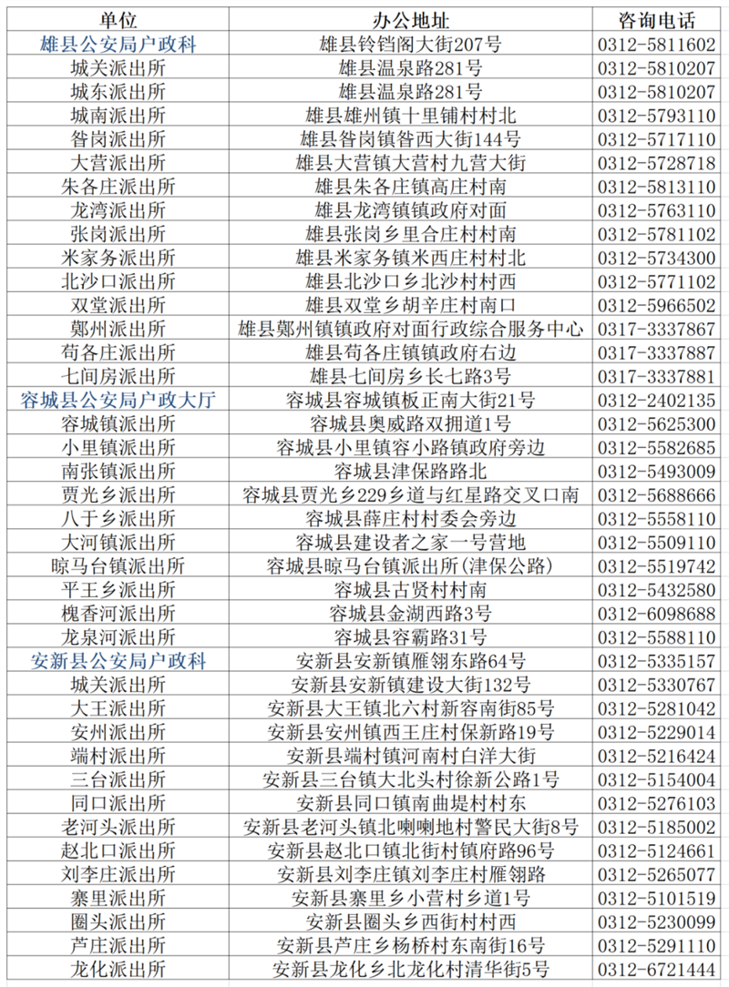 附雄安新区各派出所户籍窗口联系电话:
