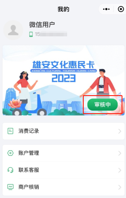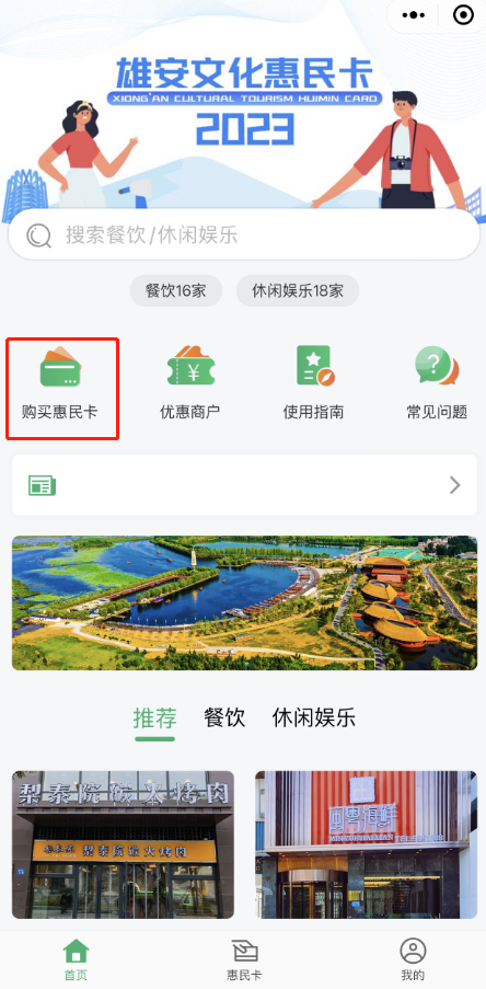 关注“文旅雄安”公众号,在底部菜单“文旅惠民-惠民卡”进入小程序。