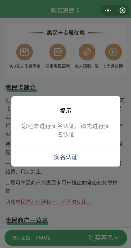 02 点击“购买惠民卡”,未实名认证提示先完成“实名认证”。