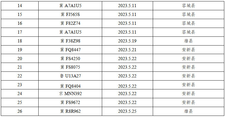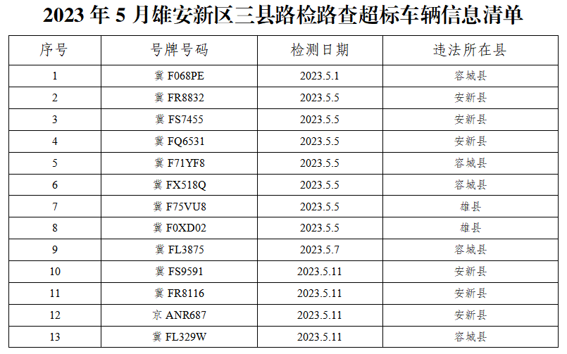 2023年5月雄安新区三县路检路查超标车辆信息清单