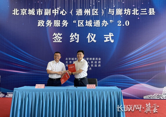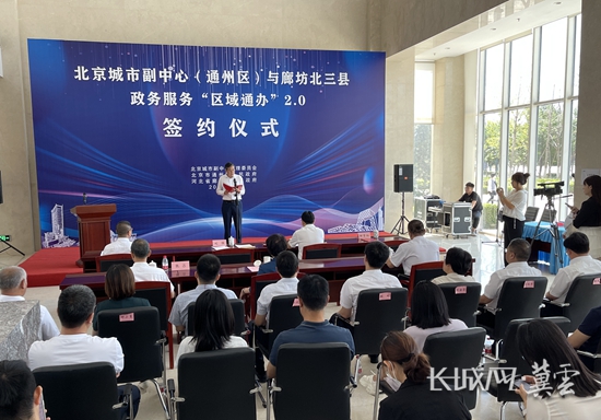 北京城市副中心管委会、北京市通州区人民政府、廊坊市人民政府签订《政务服务“区域通办”2.0版框架协议》。长城网·冀云客户端记者张航 摄