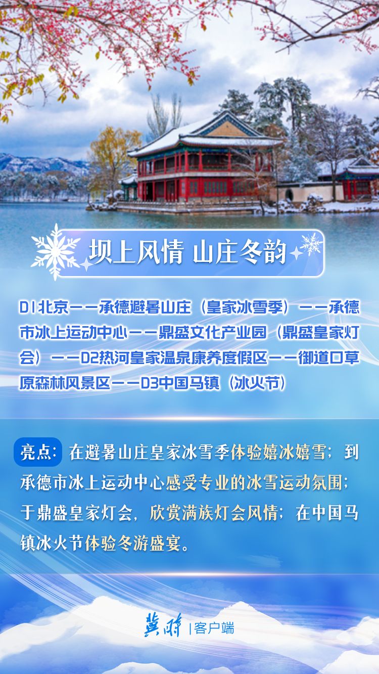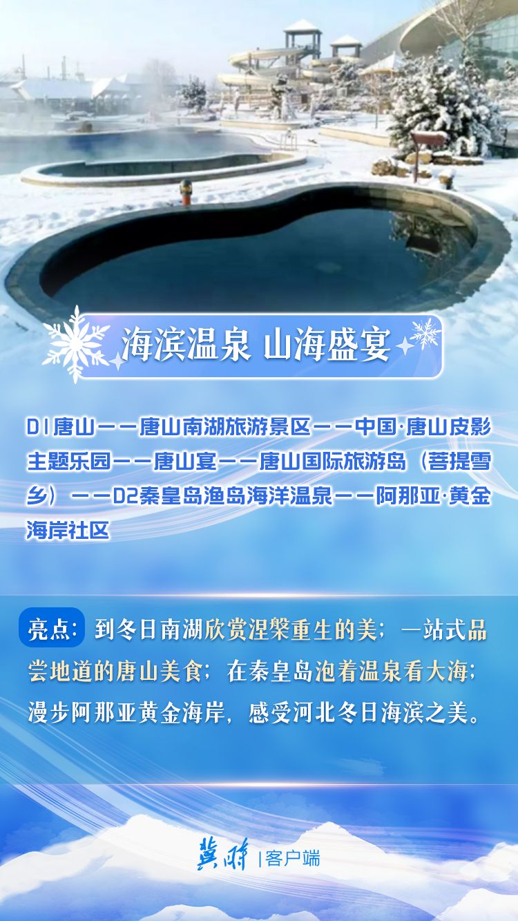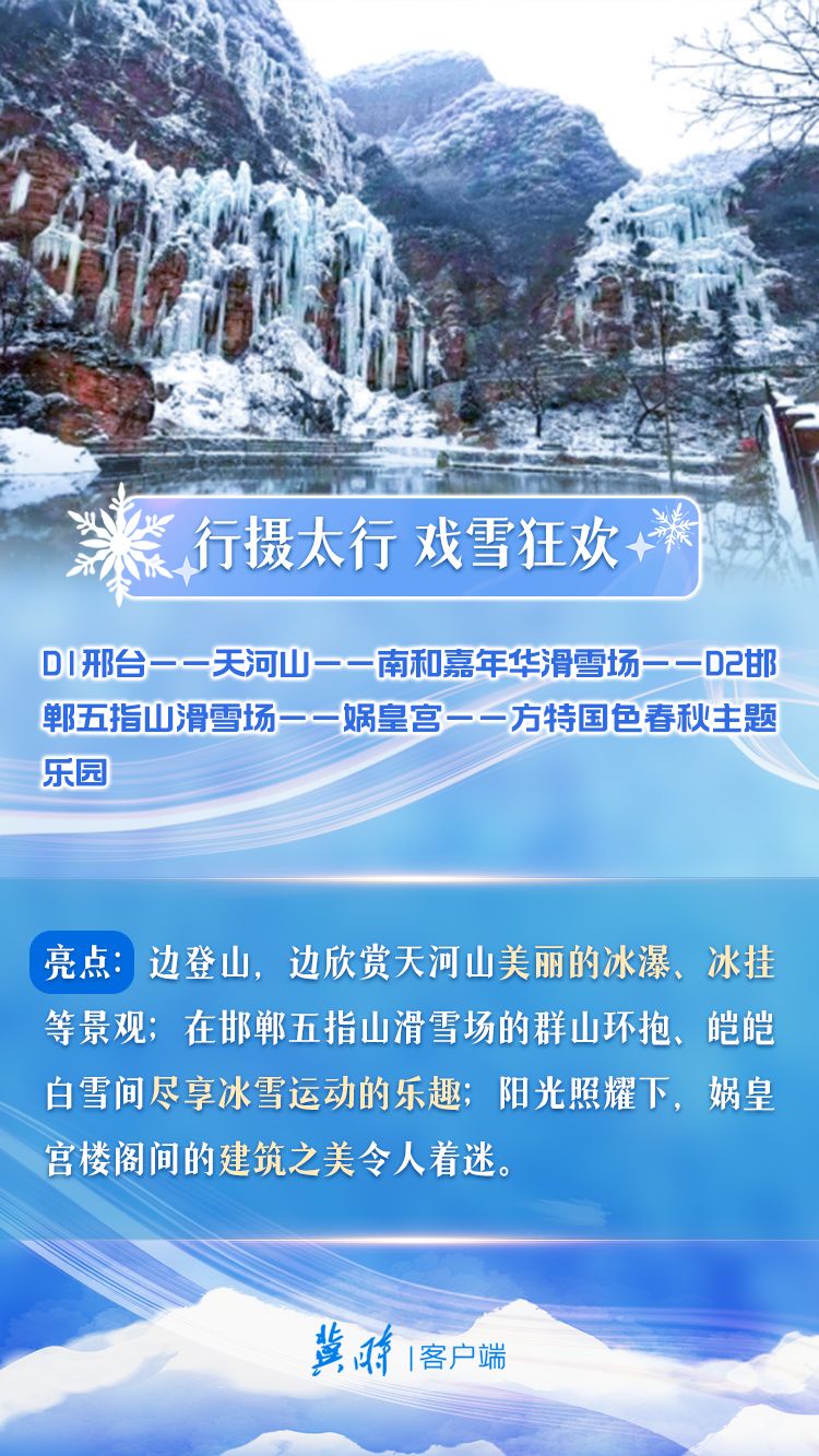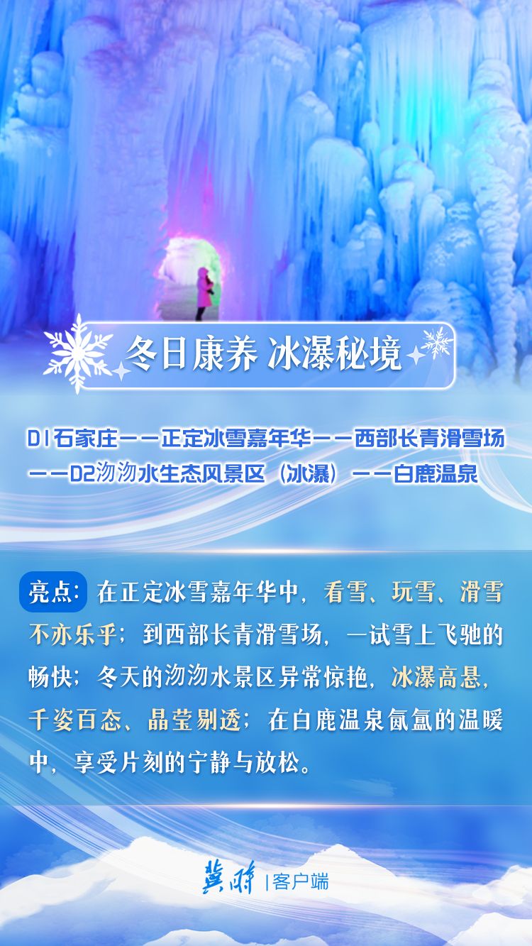 近日,河北省文化和旅游厅发布十条冰雪旅游精品线路,冬奥雪国,激情之巅;温泉康养,惬意休闲;冰瀑奇观,晶莹剔透;雪花漫舞,童趣飞扬……这个冬季,来河北,畅享冰雪之美!