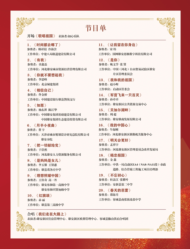 为进一步丰富雄安新区青年职工的业余生活,增进新区各主体单位青年职工的交流合作,展现雄安建设者风采,雄安新区2023“青春之歌献给党”歌唱比赛活动将于今晚19:00在雄安市民服务中心多功能厅举行。经过层层筛选,来自新区各部门、雄安集团及其子公司、参建企业、三县教师的20支参赛队伍共计26名选手脱颖而出,将亮相今晚的决赛舞台。快来看一看有没有你们喜爱或支持的选手,来为他们打call吧!我们在决赛现场等你!另外,我们将于18:20从现场观众中随机抽取30名大众评审,拿到票的观众朋友们有兴趣的话一定准时到场哦!