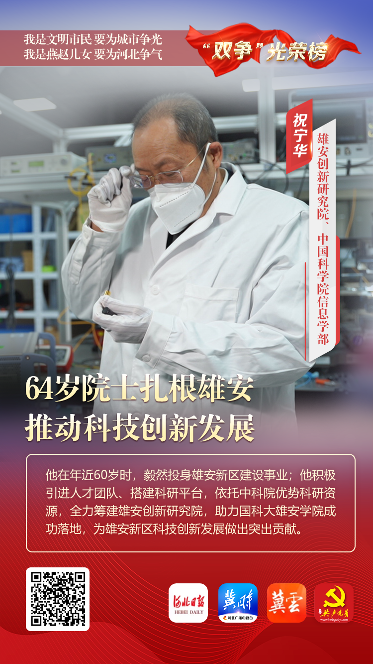 祝宁华,男,汉族,1959年12月出生,中共党员,雄安创新研究院院长,中国科学院信息学部院士。2019年,祝宁华在年近60岁时,毅然投身雄安新区建设事业。他统筹中科院优势科研资源,引进人才团队、搭建科研平台,支持雄安新区规划建设和区域创新能力提升。他大力推动新区技术交易创新,推进成果转化体系建设。2022年,他牵头负责雄安创新研究院与中国科学院大学“科教融合”协同发展,助力国科大雄安学院成功落地。带领团队承担多项科技部“十四五”重点专项任务,为雄安新区科技创新发展作出突出贡献。
