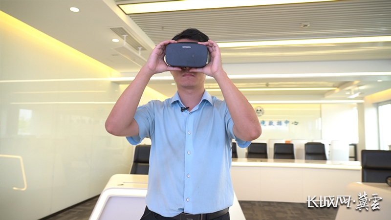 梁昊宇通过VR眼镜看白洋淀生态环境。长城网·冀云客户端记者马宁 摄