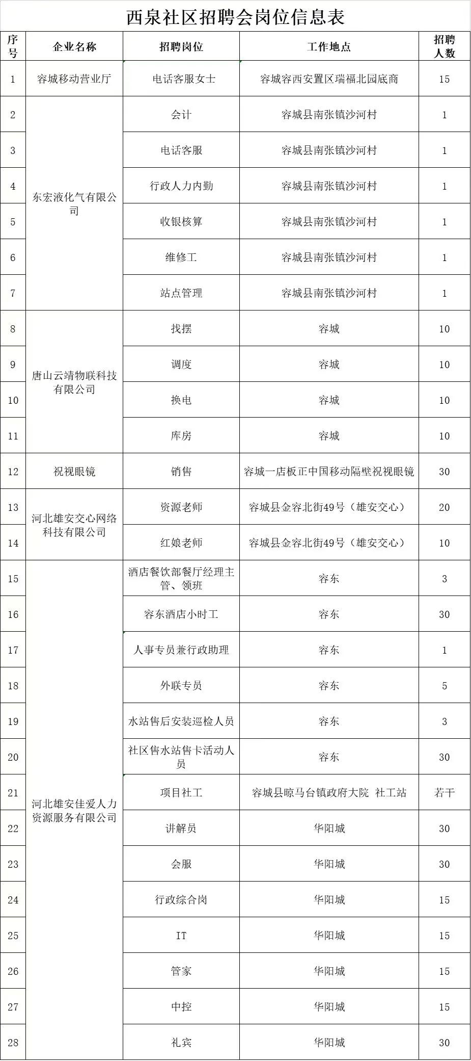 活动共邀请河北雄安佳爱人力资源服务有限公司、容城移动营业厅等6家企业,提供350余个用工需求。详细岗位信息查看下图。