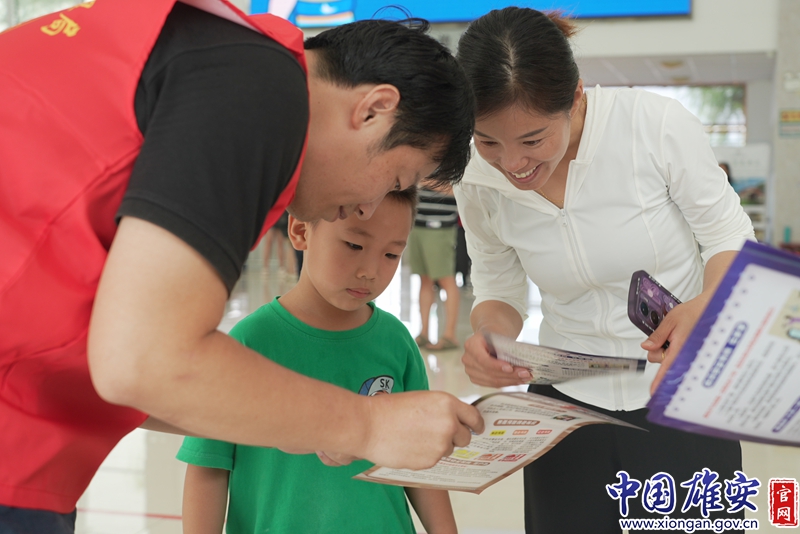 志愿者向过往游客发放防溺水宣传手册。雄安新区应急管理局供图