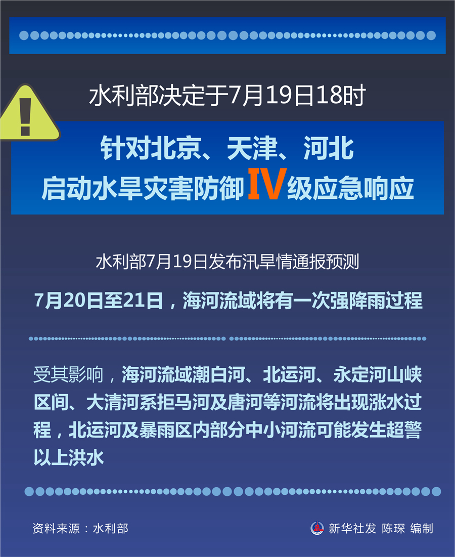 新华社北京7月19日电(记者高亢)记者19日从水利部获悉,水利部决定于7月19日18时针对北京、天津、河北启动水旱灾害防御Ⅳ级应急响应。