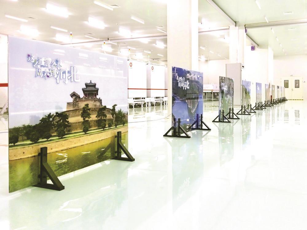 7月21日,在邯郸中建材生产车间,展示着以“这么近,那么美,周末到河北”为主题的画卷系列发电玻璃。