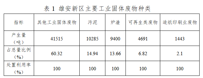 2022年,雄安新区产生一般工业固体废物68821吨,自行利用量40145吨,自行处置量60吨,转移利用处置量28036吨,贮存量580吨,处置利用率100%。主要产生的工业固体废物包括:SW59其他工业固体废物、SW07污泥、SW03炉渣、SW17可再生类废物和SW15造纸印刷业废物等,全部得到利用、处置。