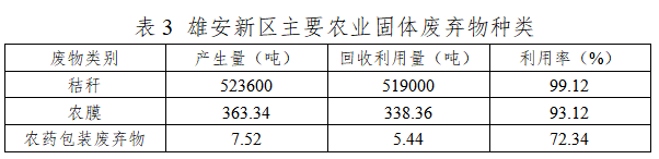 2022年,雄安新区秸秆产生量523600吨,利用519000吨;农膜使用量363.34吨,回收338.36吨;农药包装废弃物产生7.52吨,回收量5.44吨。