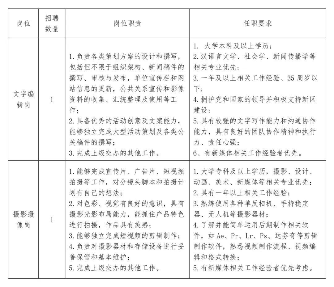 河北雄安人力资源服务有限公司(以下简称雄安人力公司)根据项目运营工作需要,现面向社会公开招聘文字编辑岗、摄影摄像岗等岗位工作人员,诚邀您的加入!