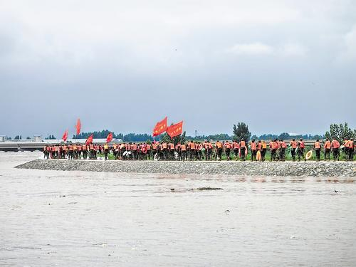 7月31日,邢台市南和区民兵应急抢险分队和武警官兵一道在南澧河大堤上固堤排险。河北日报通讯员刘立国 摄