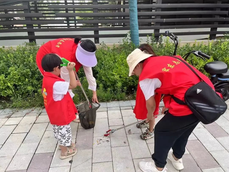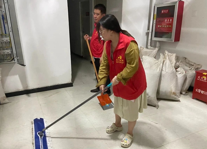 望淀社区“淀小二”志愿服务团队对雨后园区内的残留垃圾、积水泥污等进行清理,保障雨后的正常生产生活。