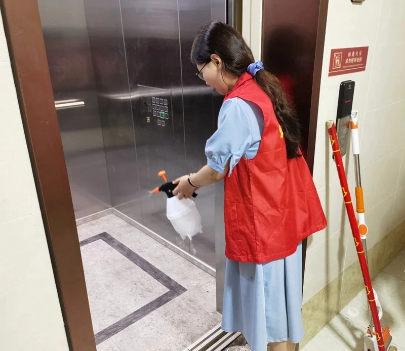 金河社区工作人员及志愿者联合开展雨后积水清理、防疫消杀工作,针对小区电梯、楼道门厅等重点积水场所消毒。