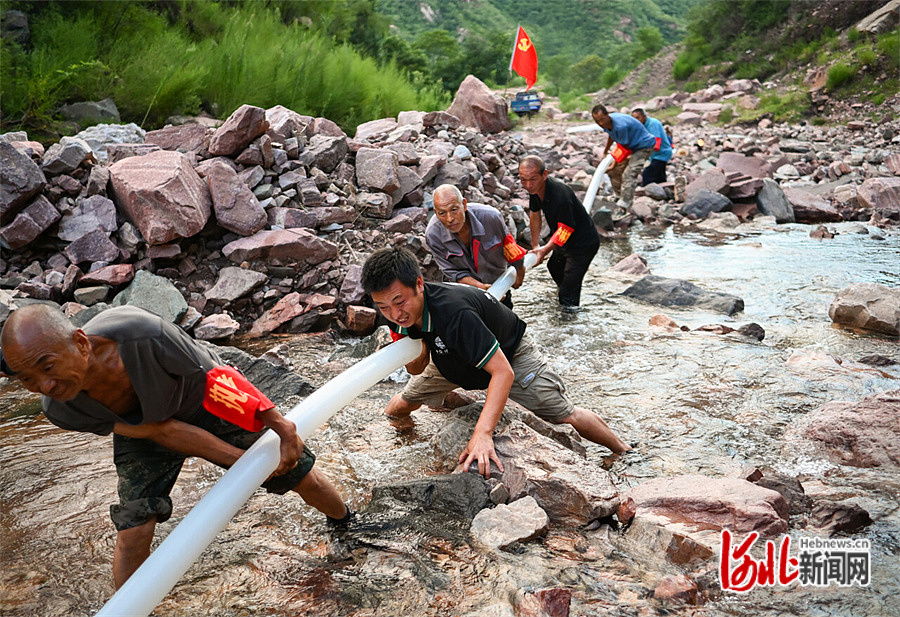 8月5日,石家庄井陉县测鱼村党员干部团结带领群众,奋力抢修水毁的饮水管网。河北日报记者赵威 摄
