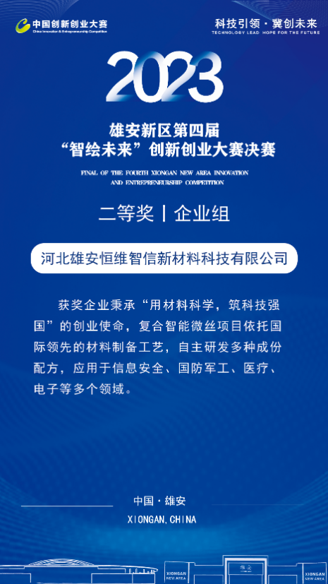 中国雄安官网8月11日电 近日,雄安新区第四届“智绘未来”创新创业大赛暨第十二届中国创新创业大赛河北雄安新区赛区决赛在雄安会展中心圆满落幕。大赛历时2个多月,经过初赛、复赛和决赛激烈角逐,河北雄安恒维智信新材料科技有限公司和空天动力团队分别获得企业组、团队组二等奖。