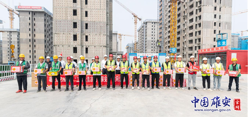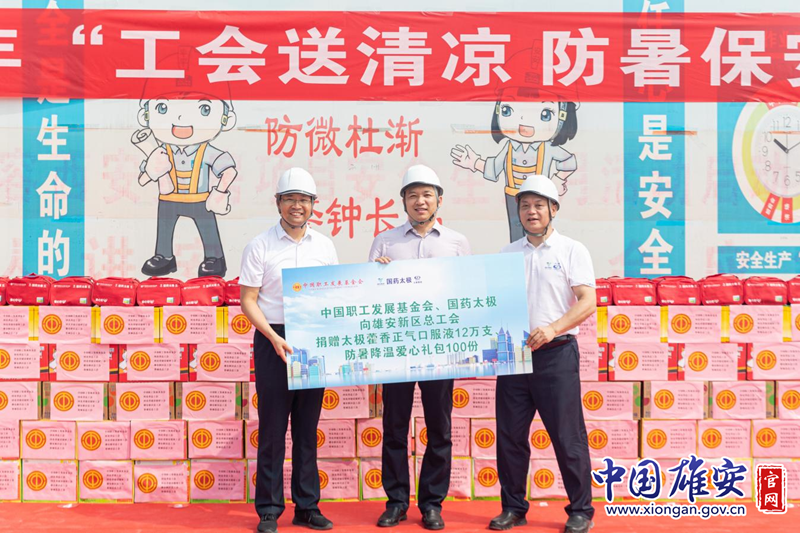 启动仪式上,中国职工发展基金会、河北省总工会、河北省建设建材工会、雄安新区总工会和雄安三县总工会相关负责人共同为参建企业代表发放防暑用品。中国职工发展基金会和国药太极向雄安新区捐赠了防暑降温物资。