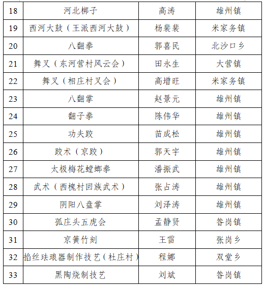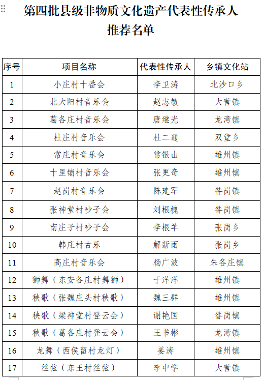 为贯彻落实《河北省非物质文化遗产条例》,进一步健全非遗传承人保护机制,健全雄县非物质文化遗产代表性项目名录体系,推动非物质文化遗产的保护、传承和弘扬,在个人申报和乡镇政府推荐的基础上,我单位按照有关规定和程序组织召开了专家评审会,对申报的非遗项目、非遗传承人进行了评审,确定了雄县第五批县级非物质文化遗产名录推荐项目22项和第四批县级非遗代表性传承人推荐名单33人。为坚持公开、公平、公正的原则,现面向社会公示,公示期自公示之日起,至8月24日止。如有异议,请在公示期内,以个人实名或单位加盖公章的形式提出书面意见。