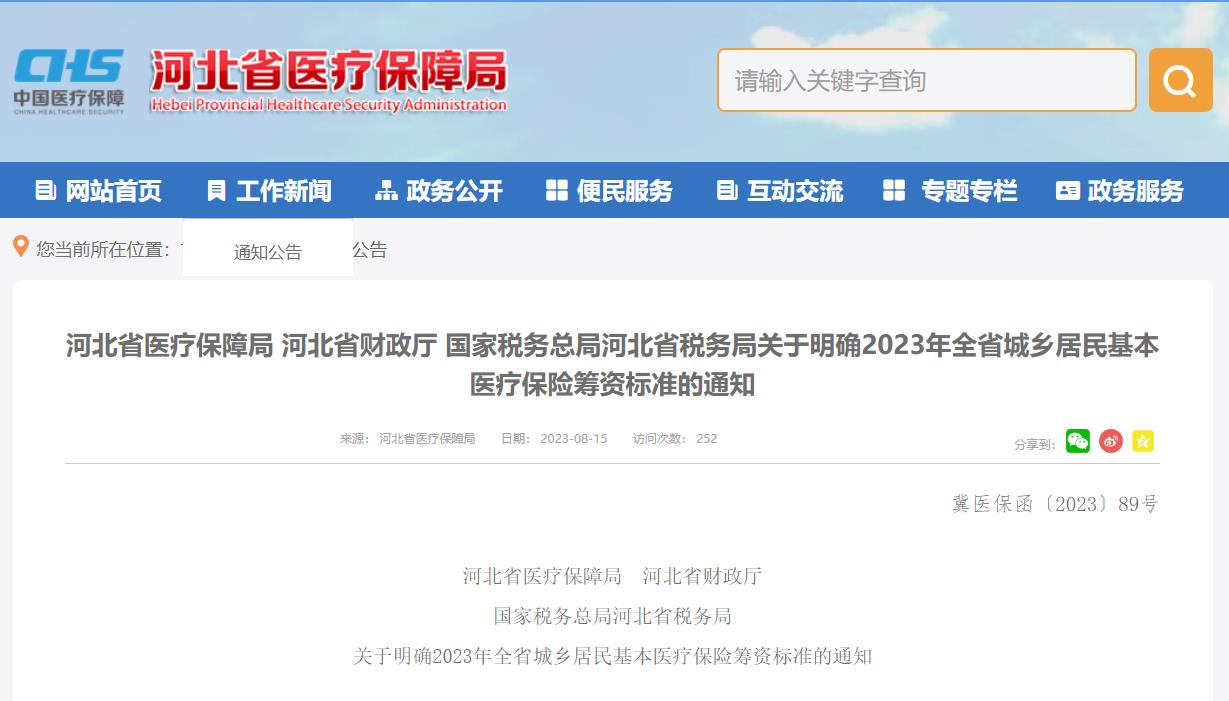 8月15日,河北省医疗保障局、河北省财政厅、国家税务总局河北省税务局最新发布关于明确2023年全省城乡居民基本医疗保险筹资标准的通知,明确2023年河北省城乡居民基本医疗保险筹资标准为1020元,其中人均财政补助标准达到每人每年不低于640元,个人缴费标准达到每人每年380元。