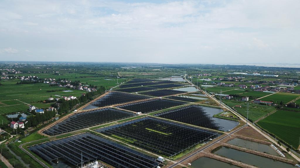 上海崇明绿华镇华星村千亩蟹塘的水面上覆盖着连片的太阳能光伏板(2023年7月25日摄,无人机照片)。新华社记者金立旺 摄