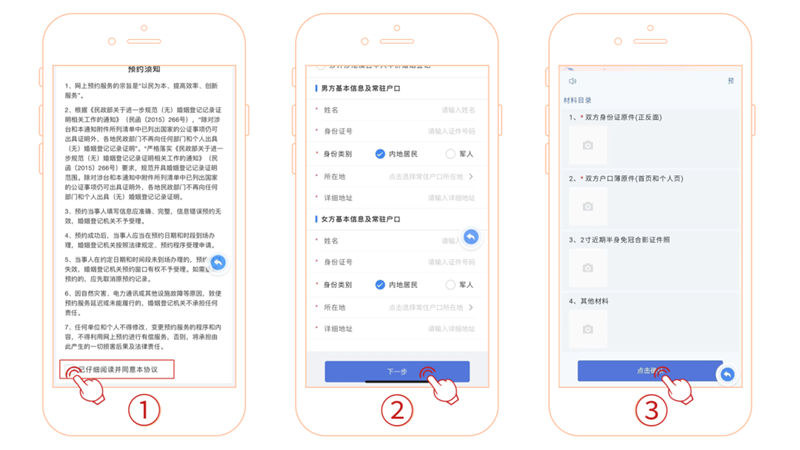 阅读“预约须知”后,勾选“已仔细阅读并同意本协议”并点击“确定”按钮。根据提示,填写男女双方基本信息,并上传相关材料。