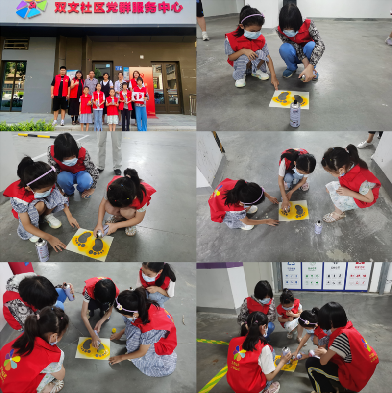 8月21日,双文社区组织“小双子星”志愿者在朝晖园地库垃圾投放点进行“小脚丫”喷绘活动,制作地图路线进行引导。小志愿者们亲自动手参与喷绘,有助于让环保精神和文明理念在他们心中扎根萌芽。