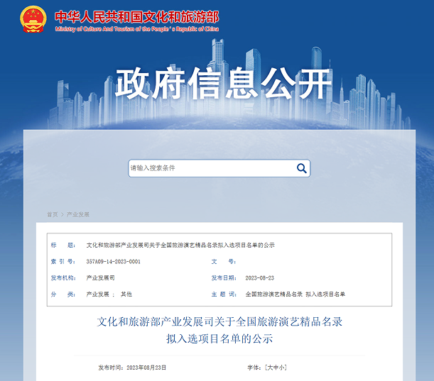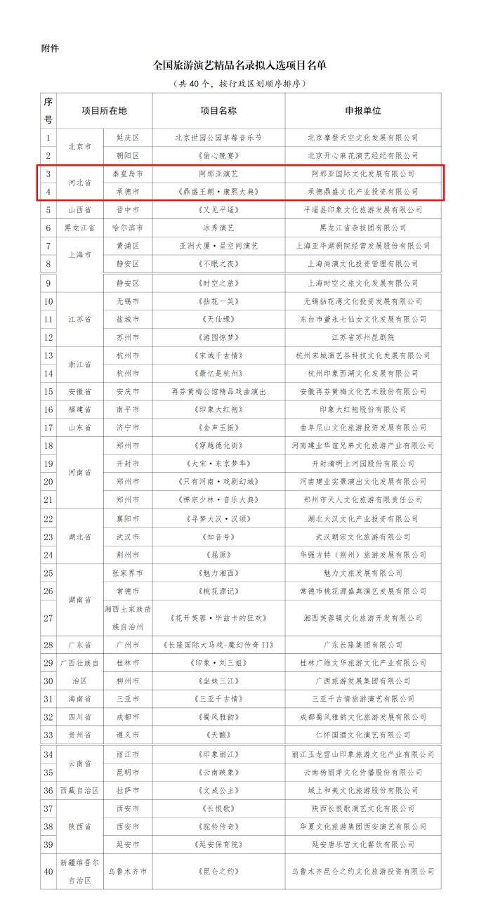 近日,文化和旅游部对全国旅游演艺精品名录拟入选项目名单进行公示,全国40个项目进入该名单。其中,河北2项目拟入选。