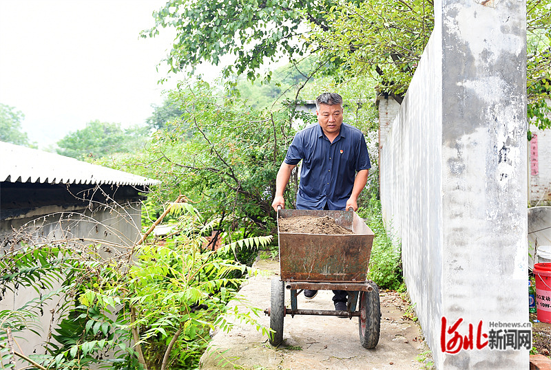 8月6日,临城县赵庄乡梁家庄村党支部书记、村委会主任郝立杰,帮村民重垒被洪水冲倒的院墙。河北日报记者赵永辉 摄