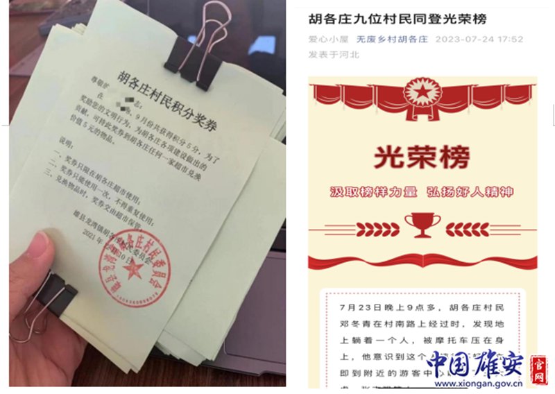 胡各庄村推出的积分奖券及光荣榜。中国雄安官网发