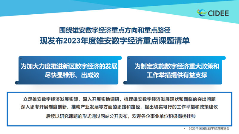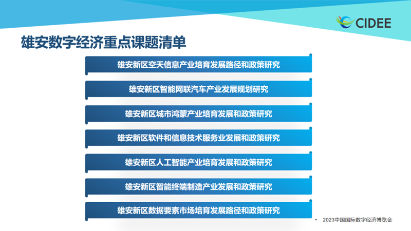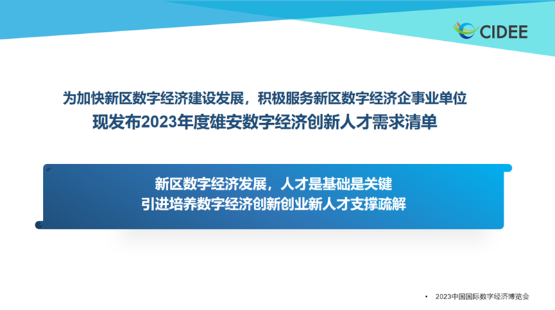 9月6日,2023中国国际数字经济博览会在石家庄开幕。由中国国际数字经济博览会组委会主办,河北雄安新区管理委员会承办的数字雄安论坛活动同期举行。论坛期间,雄安新区数字经济重点课题清单和创新人才需求清单发布。