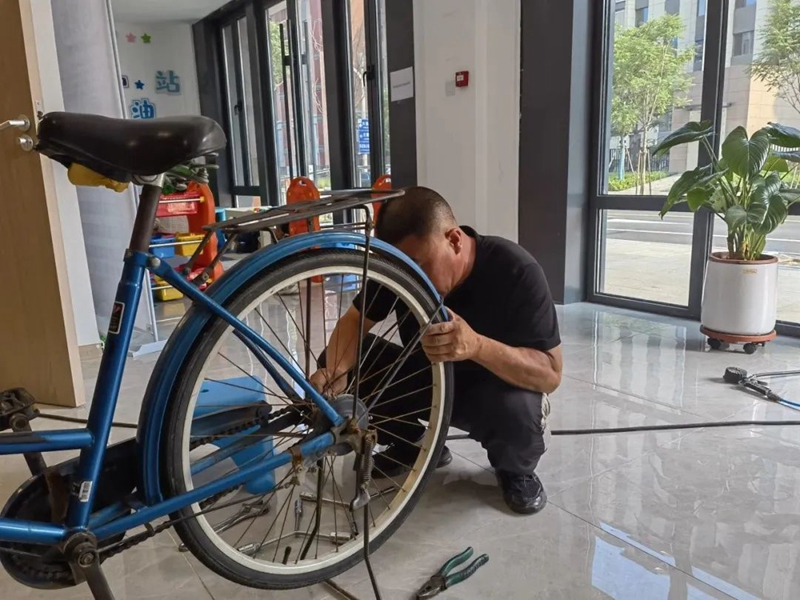 邀请银帆社区兰桨坊志愿者刘国英为居民提供自行车、电动车维修服务。