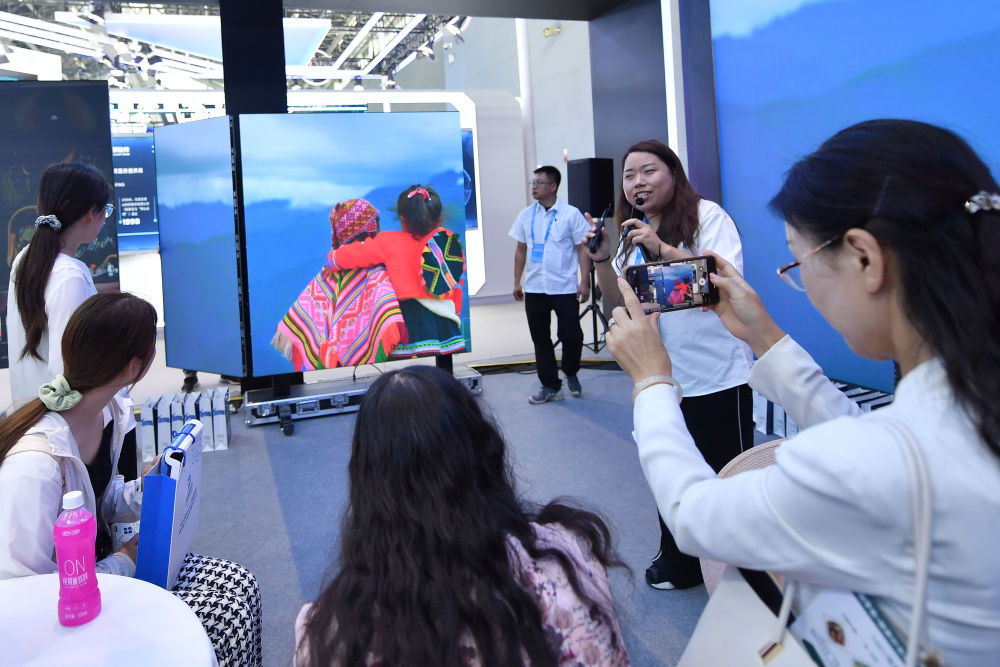 9月6日,在2023中国国际数字经济博览会上,工作人员向参观者介绍便携式升降折叠屏。新华社记者骆学峰 摄