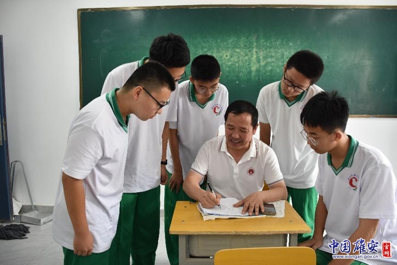 利用课间休息,蒋含丹为学生讲解难题。容城县委宣传部供图