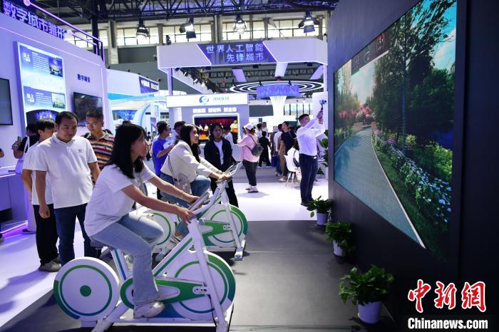 9月7日,在2023中国国际数字经济博览会雄安新区展示区,参观者通过模拟骑行体验雄安绿色生态场景。中新网记者翟羽佳 摄