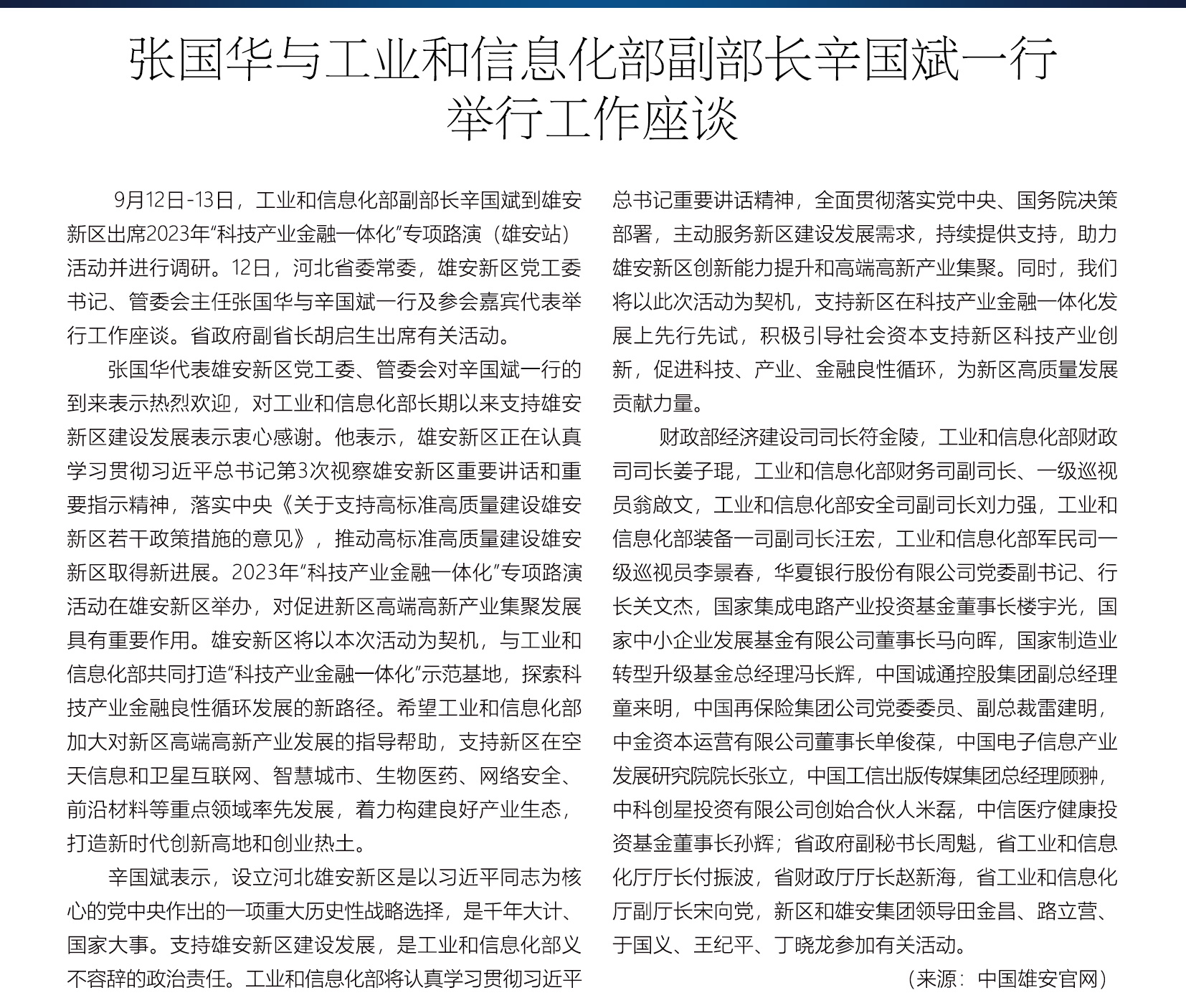 【雄安之声】张国华与工业和信息化部副部长辛国斌一行举行工作座谈