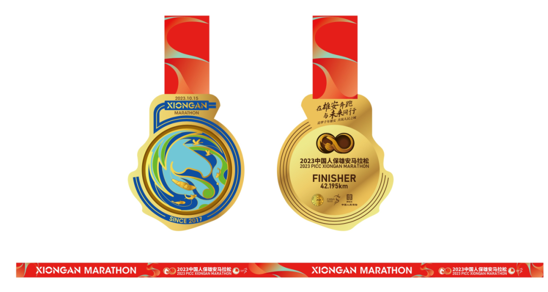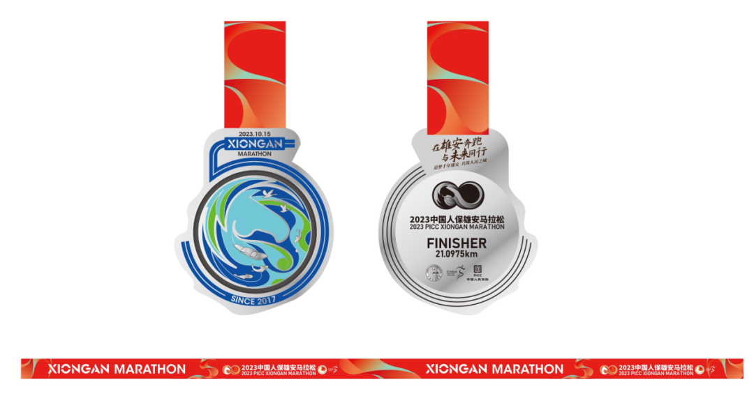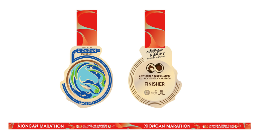 奖牌背面是以龙马体态元素组合成“∞”的赛事标志,寓意雄安马拉松赛事一路向前的美好愿景,更是作为雄马成长的一种见证。同时刻有“在雄安奔跑,与未来同行”的赛事口号,体现了马拉松赛事勇往直前的精神和雄安昂扬争先的奋斗精神。