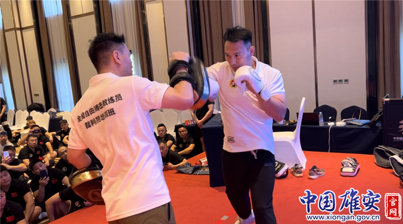 中国区首条WBC职业泰拳金腰带获得者侯旭(右)正在进行自由搏击打靶教学。中国雄安官网发