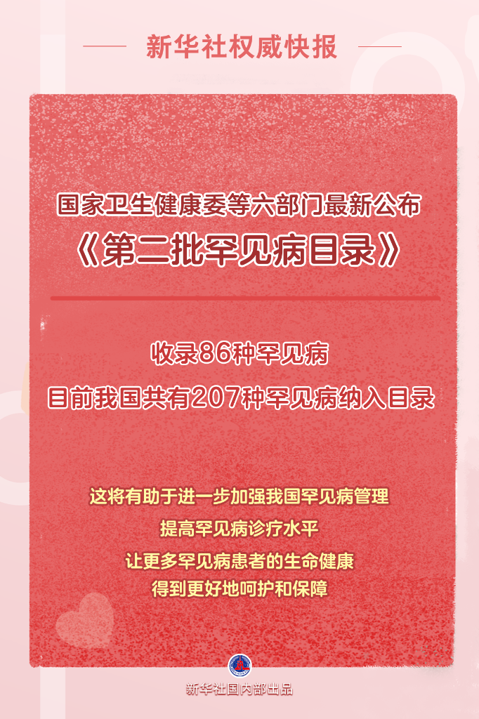 新华社北京9月20日电(记者李恒、田晓航)记者20日从国家卫生健康委获悉,根据《罕见病目录制订工作程序》,国家卫生健康委等6部门联合制定了《第二批罕见病目录》,收录86种罕见病。目前,我国共有207种罕见病纳入目录。