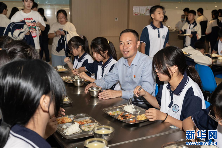 陈长保每天与不同班级学生一同吃饭、谈心。新华网发 毛鹤然摄