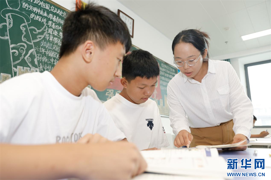 傅蔚(右一)正在给学生讲题。新华网发 毛鹤然摄