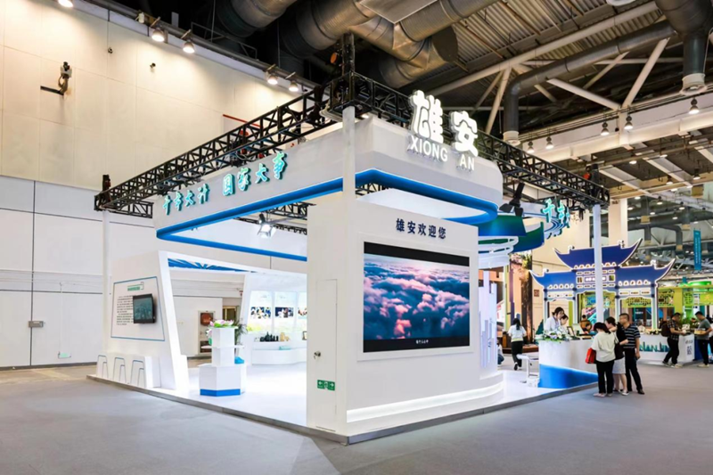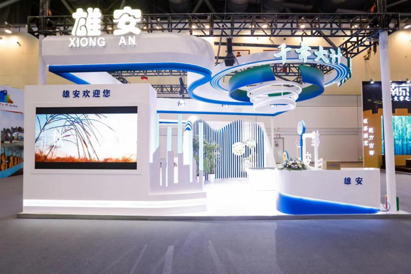 雄安新区参展主题为“千年大计 国家大事”,整个展区分为“聚焦雄安 成效展新颜”“遇见雄安 预见未来”“雄安展翼 明珠再现”“未来之城 阔步走来”四大板块,视觉以干净、清透的淀泊白为主色调,配有芦苇加以装饰,并结合雄安蓝绿相间、水城共融的色彩理念进行表现,营造出清新明亮的整体氛围。