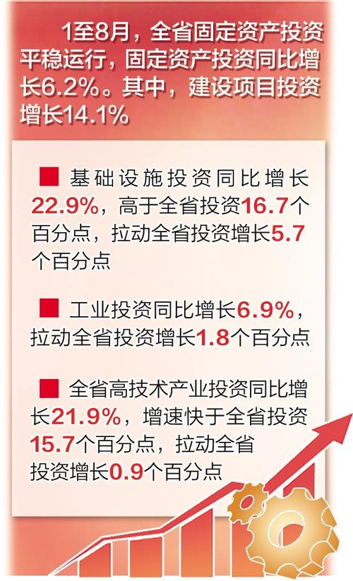 省统计局9月20日公布的数据显示,1至8月,全省固定资产投资平稳运行,固定资产投资同比增长6.2%。其中,建设项目投资增长14.1%。