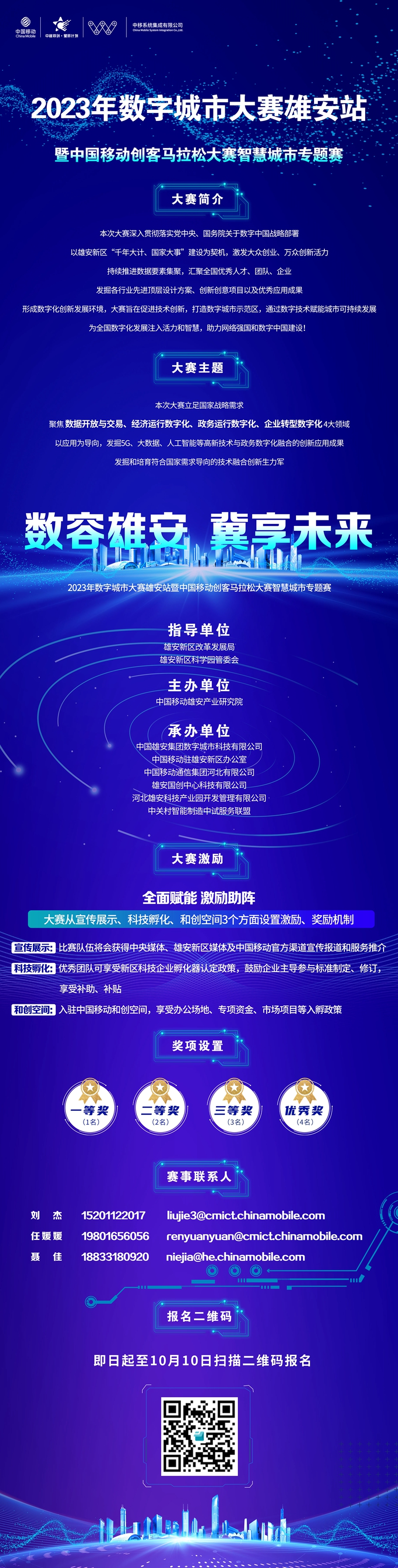 “数容雄安 冀享未来”,数字城市大赛雄安站暨中国移动创马大赛等你来战!赛事报名和提交方案截至10月10日,欢迎扫码报名。