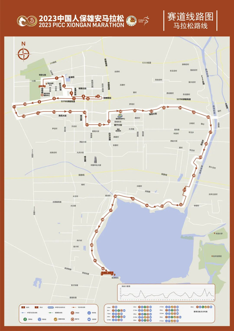 马拉松路线:雄安城市计算中心(雄安之眼起点)-白塔路-金湖街-明朗北街-金湖东路-明朗南街-明朗南街折返点-白洋淀大道-海岳大街-博远路-易宁大街-白洋淀路-海岳大街-白沟引河路段-环堤路-白洋淀旅游码头附近(终点)